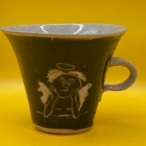 Kjempefin hånddreid og morsom keramikk-kopp med kattemotiv laget av anerkjente Bryan Evans, Arendal. https://no.wikipedia.org/wiki/Bryan_Evans Svart og creme-farget.