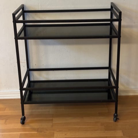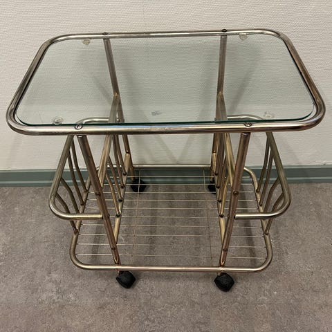 Flott trillebord (bartralle) i funksjonalistisk design. Den fremstår nærmest som ny. Stabil og solid konstruksjon. B x D x H: 80 x 50 x 84. Stativet for 8 flasker kan demonteres.