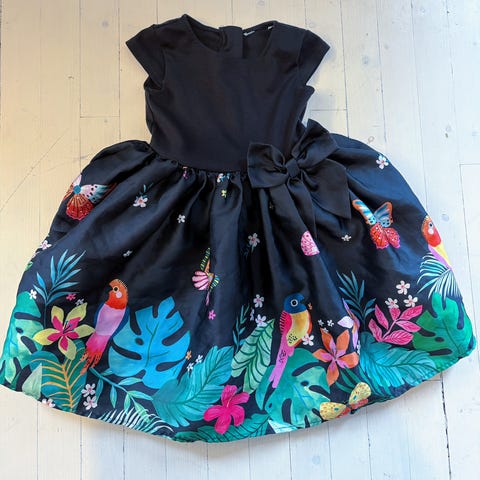 H&M Klänning i beige farge, størrelse 104 for jente. Laget av en blanding av bomull, polyester og metallfibre. Inneholder 55% bomull, 38% polyester, 7% metallfibre. Klänningen har korte ermer og knappelukking bak.