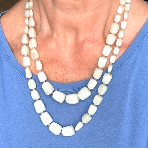 Veldig milde og feminine halssmykke i nydelig, varm farge. Jeg tror de er laget av plast og imitert stein, men ser overraskende elegante ut. Lett å kombinere med både hverdagsantrekk og noe mer pyntet.