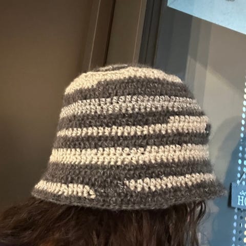 Selger en nydelig blå strikkelue med blomsterdetaljer. One size og helt ny, aldri brukt.