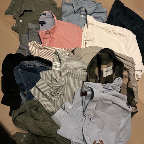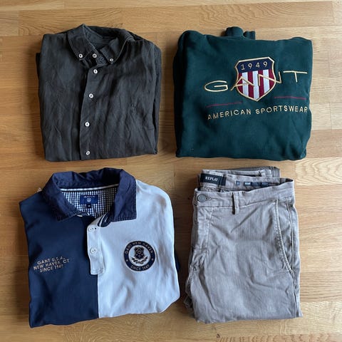 Selger en pakke med herreklær fra Gant i størrelse L og 34/32. Pakken inneholder 3 skjorter, 1 genser, 2 t-skjorter og 1 bukse. Ingen slitasje. Selges samlet til 2000,- eller 400,- pr stk.