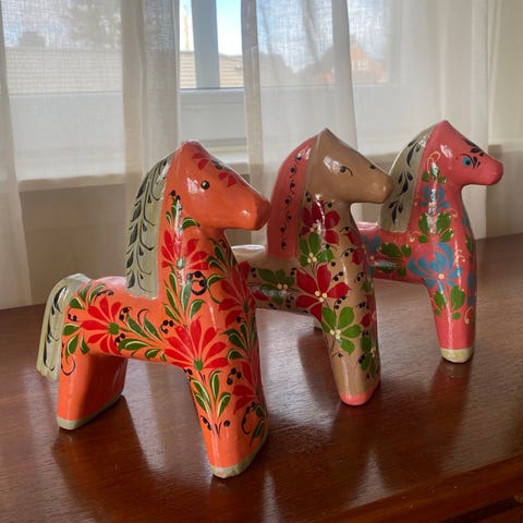 Håndlaget katter i tre - skulpturer med en høyde på ca. 60 cm. Skulpturene har detaljer i brun og beige farge, med utskårne mønstre og malte øyne. Passer som dekorasjon i hjem eller kontor.