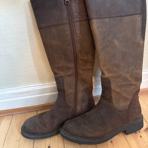 Clarks Vinterstøvler i størrelse 4 (35-36) med brunsvart farge og fôret innside. Støvlene har snøring foran og såle med mønster for bedre grep. Materialet er semsket 100% skinn, med mykt og varmt fôr.