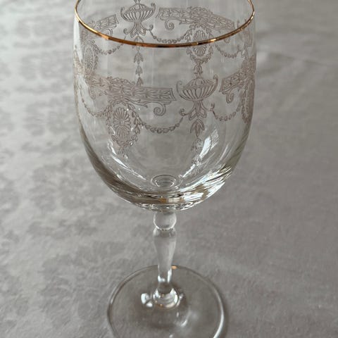 8 stk vinglass i pen krystalllook (ikke ekte krystall). Ukjent merke. Selges samlet.