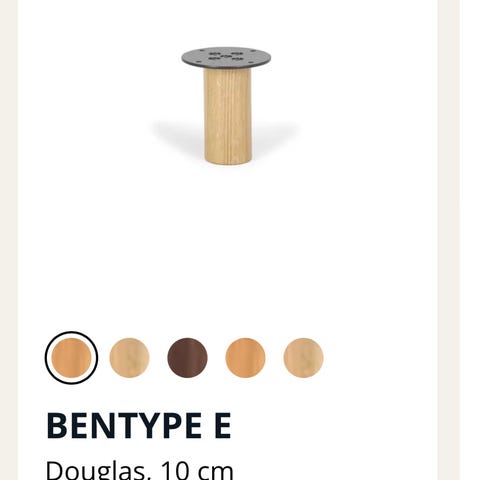 Sett med 12 svarte møbelben i treverk og plast, inkludert skruer for montering. Benene har en enkel sylinderform og vinkel for de synlige, og er egnet for bruk på møbler som sofaer, senger eller skap for å heve dem fra gulvet.