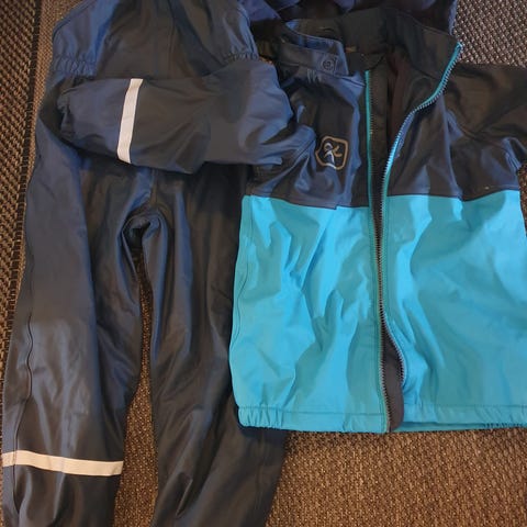 Pent brukt regntøy med fleece. Brukt en sesong. Str 110/116. Strikkee under bena er inntakte.