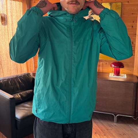 The North Face jakke i gul farge, størrelse M for menn. Jakken har hette og er laget for utendørs bruk med slitesterkt materiale.