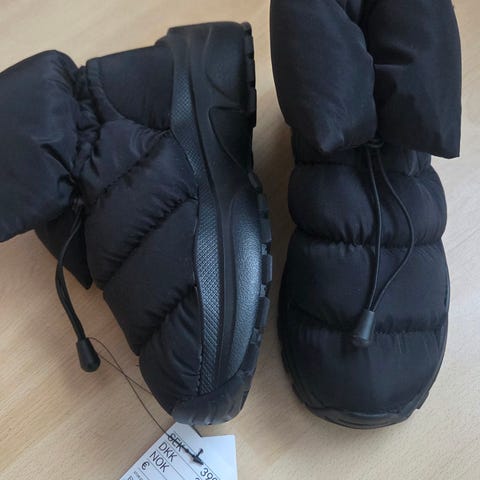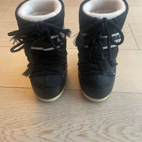 Moon Boot vintersko i størrelse 39 til 41 , unisex design, i svart farge. Laget med isolerende materiale for å holde føttene varme i kalde forhold. Støvlene har snøring foran for justerbar passform og en solid såle for godt grep. Egnet for bruk i snø og vintervær. Den er litt slitt inni men jeg merker ikke det så det er supert😄