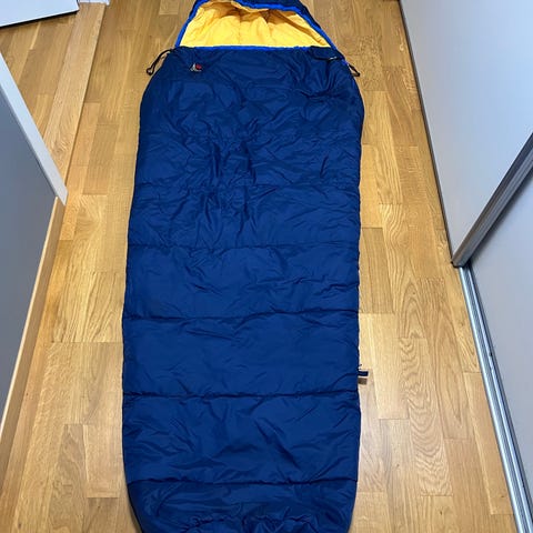 Wigwam junior sovepose i blått og gult med snorstramming. Størrelsen er ikke oppgitt i soveposen eller trekket, men ved måling av posen fra bunnen opp til starten av hetta, er posen omtrent 145 cm. Inkludert hetta er posen omtrent 175 cm. Vekta på soveposen med trekk er omtrent 1600 gram.