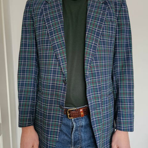 Veldig fin ulljakke kjøpt brukt i sommer. Dessverre fant jeg etterhvert ut at den er litt for stor. Størrelsen passer bra til L/52 som jeg vanligvis bruker, men den er litt ekstra bred over skuldrene. Jeg har forsøkt å ta noen mål for å illustrere dette: armlengde (66 cm), skulder-nakke-skulder (56 cm), mage (110 cm).