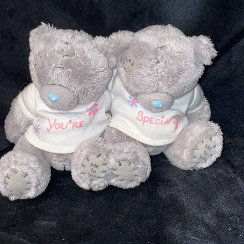 Me to You bamse i grå farge med hvit strikket genser. Bamsen har brodert detalj på foten med teksten "Me to You". Laget av mykt materiale, egnet som kosedyr for barn.