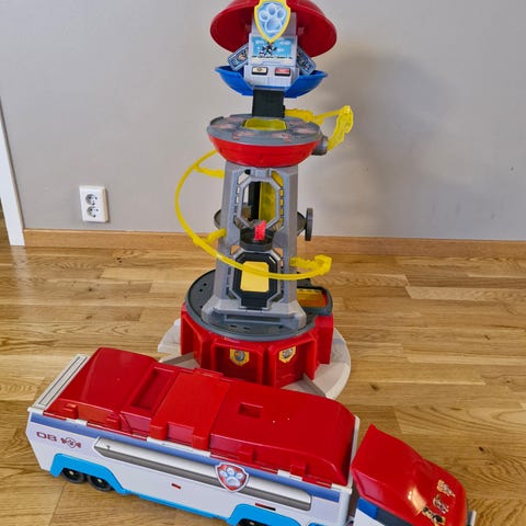 Selger pent brukt paw patrol utsiktstårn med to figurer (Chase og Marshall) og medfølgende biler. Litt slitasje på Chase figur og bil, se bilder. Ingen skader på tårnet. Heis fungerer og det samme gjør lyd (potemerke). Selges samlet for kr. 500.