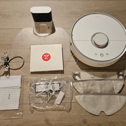 Xiaomi Roborock S5 robotstøvsuger i hvit farge. Leveres med ekstra børster, filtre, moppekluter og ladestasjon. Designet for automatisert rengjøring av gulvflater.
