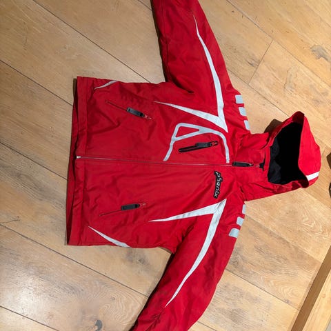 Spyder skalljakke for unisex i størrelse M. Jakken har rød og hvit fargekombinasjon og er laget for sport og utendørsaktiviteter. Den inkluderer hette, flere lommer med glidelås, og et innvendig snølås-system. Materialet er designet for å være værbestandig og egnet for ulike værforhold.