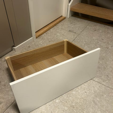 Selger en Bestå-skuff. Skuffen er svart, og fronten er høyglans hvit.