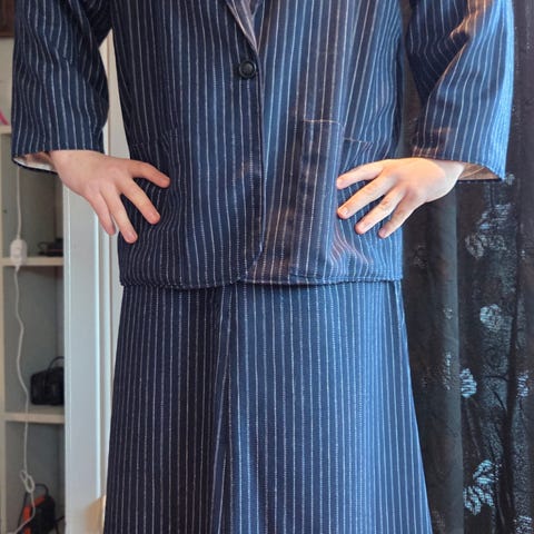 Elegant todelt drakt (jakke og skjørt) i en dyp marineblå farge. Laget av ull-lignende/varmt stoff, perfekt for kontoret, formelle anledninger eller vintermånedene. Jakken er lang og har én knapp og store lommer, mens skjørtet har et klassisk, rett snitt (midi-lengde). Et tidløst og profesjonelt sett.