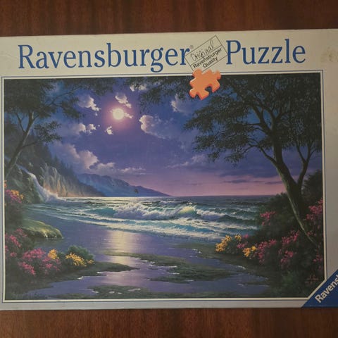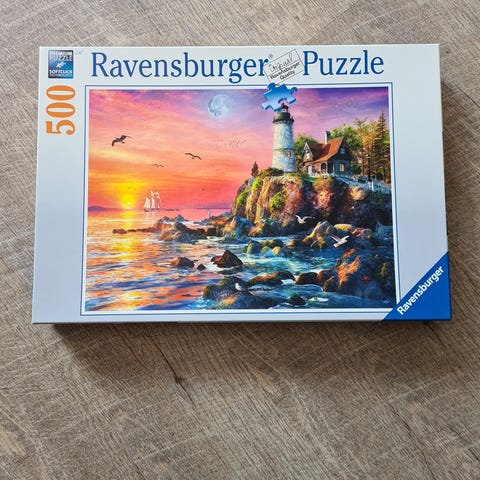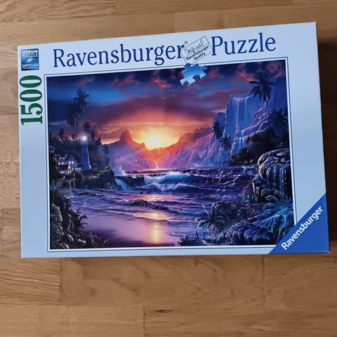 Ravensburger Puslespill med 1500 biter som viser et motiv av en solnedgang over et landskap.