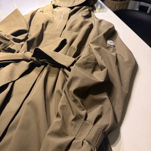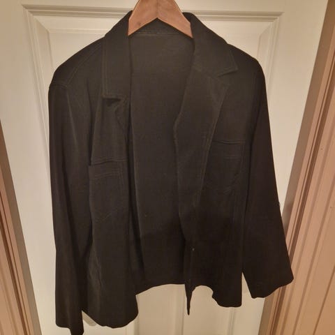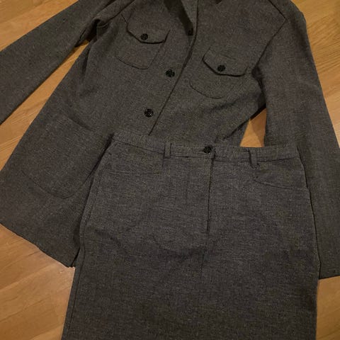 Elegant og klassisk dressett i to deler (jakke og bukse) fra merket Merrytime. Settet har en nøytral og pen farge (taupe/brun-grå) og passer perfekt til kontoret, møter eller formelle anledninger. Buksen er en vid, høytlivs-modell med press, og jakken er klassisk med to knapper og dekorative sømmer. Laget i 100% polyester. Størrelse: DK 48.