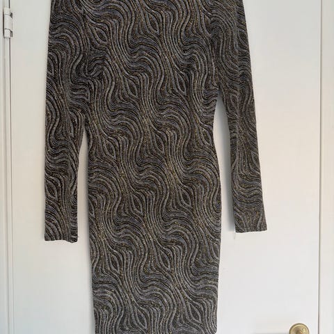 Nelly festkjole i svart farge, størrelse S. Kjolen har et mønster med hull og lange ermer. Kjempefin. Kun prøvt på en gang. Var for liten for meg.