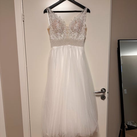 Kjøpt i Sverige i 2021 for 8000kr. kun brukt en gang og i fin stand. Ingen flekker eller hull og alle knappene er på plass. Var en «singlet kjole» hvor en blonde topp er sydd fast over. Komfortabel å ha på. Str 48.