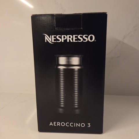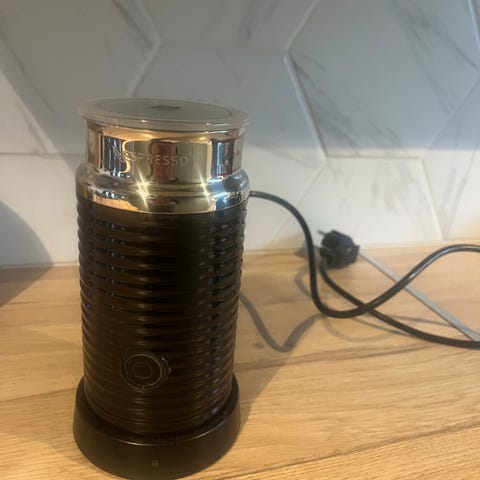 Melkesteamer / melkeskummer fra Nespresso i off white / creme farge. Pen og anvendelig, rommer 240 ml. Vært en favoritt i flere år, men fikk en nyere modell i julegave. Noen bruksmerker og riper på lokket, men fungerer ypperlig til å lage varm og kald melk eller melkeskum.