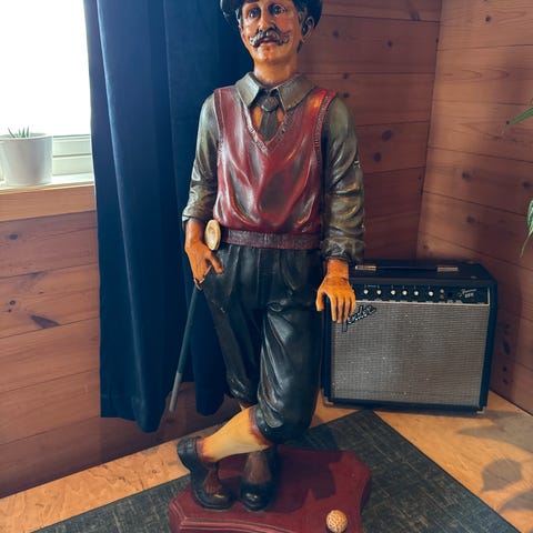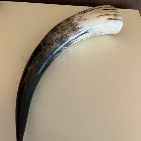 Kjøpt på aktivitets butikk for 10 år siden. Opprinnelse ukjent. Ble fortalt av selger at sjømenn tok med seg slike gjenstander når de seilte hjem. Hornet har ulike utskjæringer, se bilde.