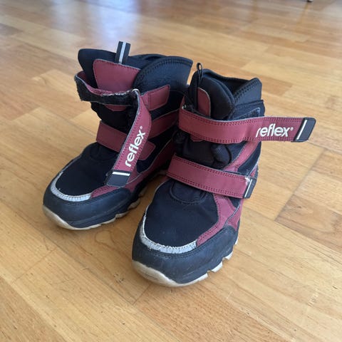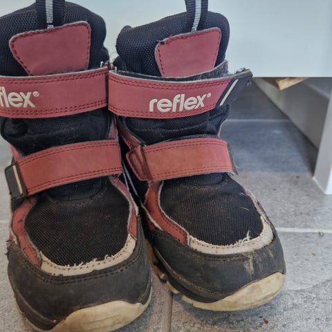 Reflex barn vintersko i størrelse 35, designet for jenter. Skoene har rød og svart fargekombinasjon med borrelåsfester for enkel justering. Materialet ser ut til å være en kombinasjon av tekstil og syntetisk materiale som gir beskyttelse mot kulde og fuktighet. Skoene har en robust såle med godt grep, egnet for vinterbruk. Var i bruk en vinter
