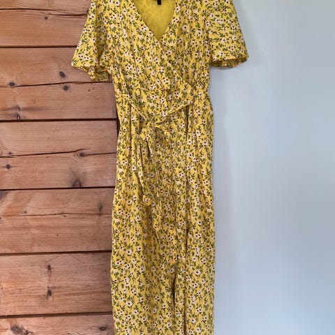 Place du Soleil Sommerkjole i størrelse S, gul farge med blomsterprint. Laget av 100% viskose. Kjolen har kort arm med volangdetaljer og knyting i midjen. Egnet som sommerplagg for kvinner.