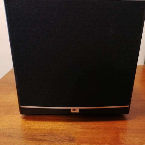 JBL subwoofer med metallgitterbeskyttelse og MTA Audio forsterker