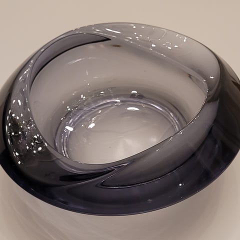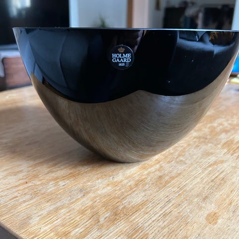 Holmegaard grey/smoke glass skål med sort/smoke topp. Skålen er laget av gjennomsiktig glass og har en rund form med en bred åpning. Den kan brukes til servering eller som dekorasjon.