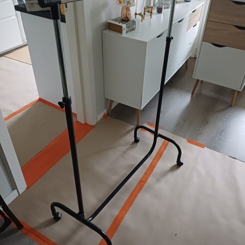 klesstativ laget av metall med en glasshylle øverst. Må skrus til en vegg. Stativet har plass til oppheng av klær og en nederste del med metallstenger for oppbevaring av sko.