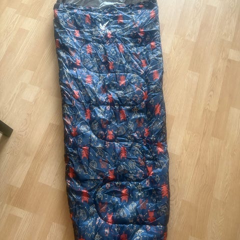 Arctic Tern Kids Dot sovepose med dinosaurmønster, designet for barn. Soveposen har en størrelse som passer for barn, med fargerikt dinosaurprint på utsiden og lys grå innside. Materialet er egnet for utendørs bruk og gir komfort under overnatting i kaldere forhold.