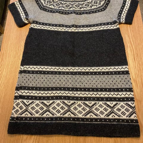 Ubrukt hjemmestrikket jakke. Selges fordi jeg dessverre ikke er høy nok til at den faller helt som den skal.