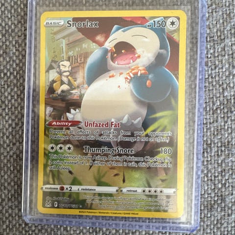 Pokémon Snorlax GX samlekort med 260 HP. Kortet har angrepene Strength (80) og Toss-and-Turn Press (120+). Kortet er i standard pokémonkortstørrelse og har holografisk design på forsiden. Baksiden viser det klassiske Pokémon-kortdesignet med Pokéball.