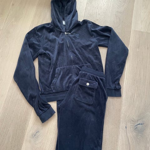 Pent brukt jakke og bukse fra Juicy Couture. Grønn velur. Bukse str 9/10. den er veldig pent brukt. Jakke i str 10/11. pent brukt - men gull logo er nesten gått bort i vask. Selv på ull/silke program: