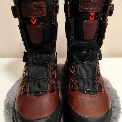 Fra Viking sin nedside - https://vikingfootwear.com/no-NO/villrein-ii-gtx-boa-leather-dark-brown-hunting?size=40