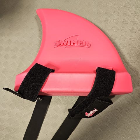 Den festes enkelt med to justerbare borrelåsstropper og passer for barn i alderen 3 til 6 år (15-30 kg), men kan også brukes av både yngre og eldre barn. SwimFin er rosa.