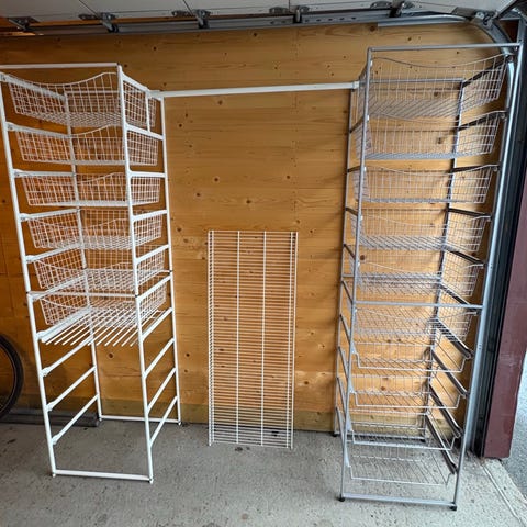 Norscan trådhyller i sølv, en seksjon, 55cm bred. 185cm høy, 50cm dyp med 9 hyller, selges 1000kr, nypris er 3825kr.