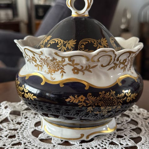Begge deler er hvite med blomsterdekor i rosa og gult, samt dekorative detaljer i gull. Kaffekannen har lokk med dekorativt håndtak, og sukkerbollen har to håndtak og lokk. Passer til servering av kaffe/te og sukker.