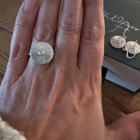Settet er i sølv med 14 ct gullforgylt.Små stener i ring og øredobber