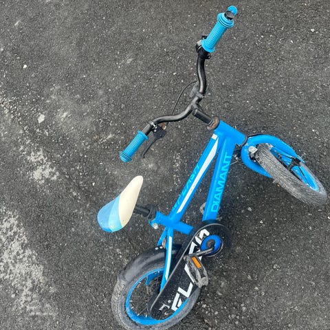 12 tommers hjul, hvit ramme med blå detaljer. Passer for små barn. Sykkelen har et enkelt design uten gir, egnet for nybegynnere. Jeg har fjernet pedalene, slik at den fungerer som balansesykkel.