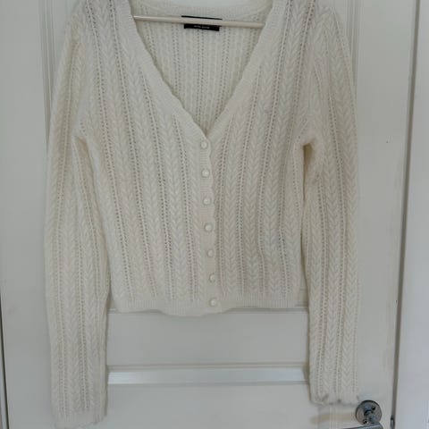 Genser fra Zara i snøhvit farge med nydelige dekorative knapper. Genseren er myk og varm siden den er laget av et pusete materiale. Str S men tilsvarer en XS