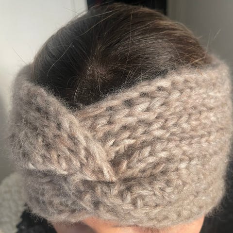 Nytt beige nydelig hjemmestrikket pannebånd i ullmiks til dame. Strikket i Drops Air.