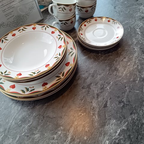 Har 6 middagstallerkener og 5 suppeskåler.
