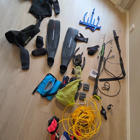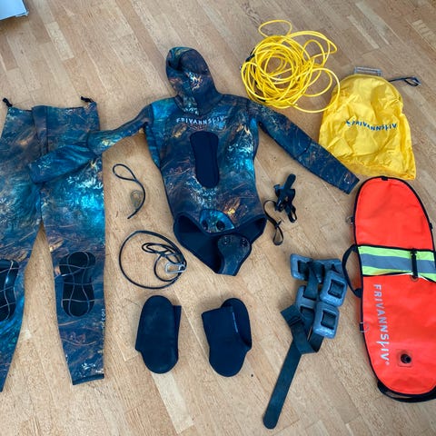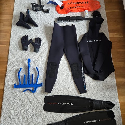 Nesten komplett fridykkerutstyr fra Frivannsliv. Optimal Evo 7 mm drakt i str L for vinterdykking kun brukt 4 ganger. Harpun og Hawaiislynge har aldri vært brukt. Blybelte+blyvest. Her mangler bare maske/føtter/kniv. Jeg er 185 cm høy. Er åpen for bud.