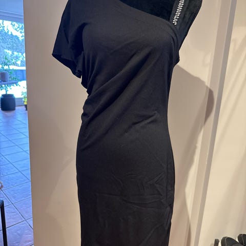 Veldig fin Cream kjole i størrelse S. Brukt kun én gang. Kjolen har mønstret stoff med kontrasterende svarte partier og 3/4 lange ermer. God stretch i stoffet.