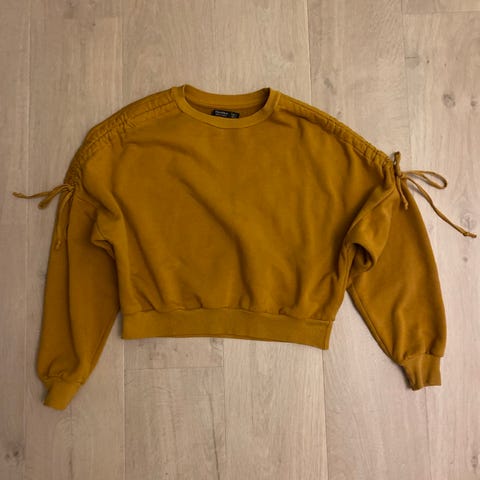 Bershka genser i størrelse S for kvinner. Genseren er grå og laget av mykt, plysj-lignende materiale. Den har en høy hals og en løs passform, egnet for hverdagsbruk og kalde dager.