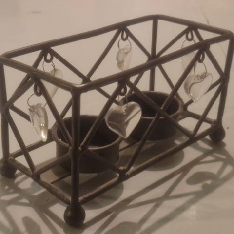 Fin rustikk lysestake/lykt i sortmalt tre, på hver ende er det påmontert to jernringer.