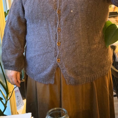 Grå jakke /blazer i ull-blanding (60% ull/40% polyester) strl.44 fra GODSKE. Romslig jakke som lukkes med en knapp. Uten for. Ca 80 cm lengde.